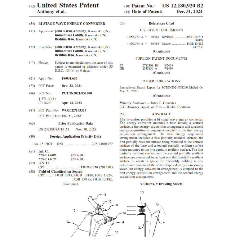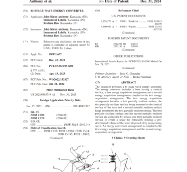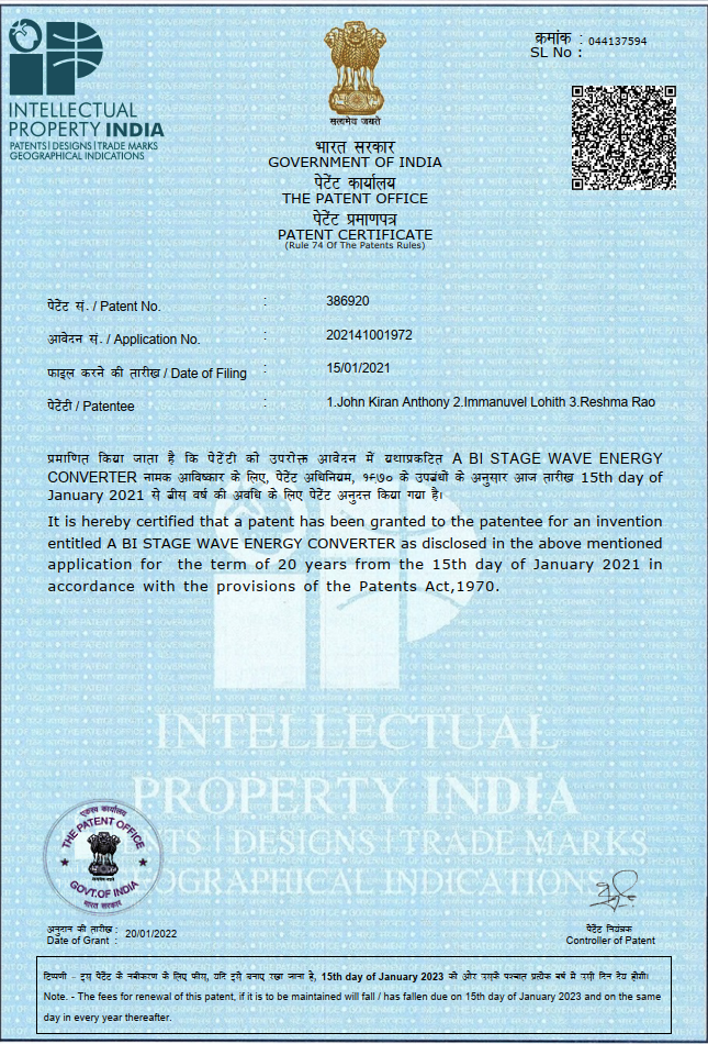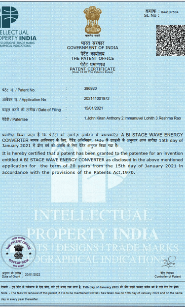 Our innovation reached the international stage when the United States Patent Office granted a patent, adding global recognition to our intellectual property portfolio. This marked Loierc Power’s transition from a promising Indian startup to a globally acknowledged innovator in ocean energy.